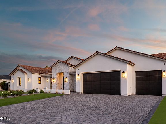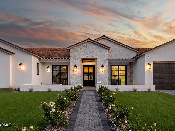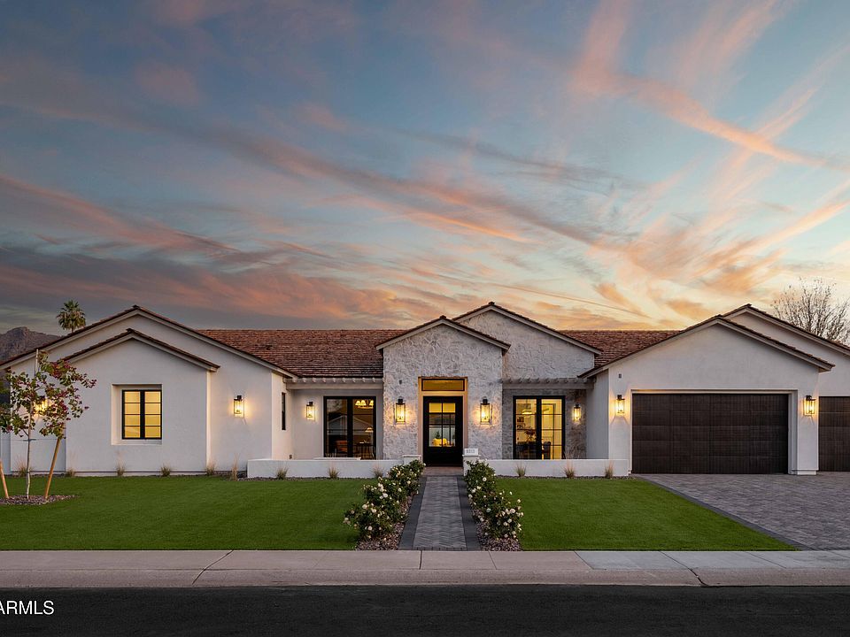 Experience the best of Arcadia Proper living in this exquisite coastal-style estate by Toon Co. Development. Set with the stunning backdrop of Camelback Mountain, this newly constructed five-bedroom, six-and-a-half-bath home spans 5,213 square feet on a generous one-third-acre lot. From the moment you arrive, you will appreciate the shake roof and timeless curb appeal, while inside, reclaimed French limestone fireplaces in the family room and master retreat provide a sense of warm sophistication. The open-concept main level is designed for full family living, featuring a dedicated office, formal dining room, gourmet kitchen, inviting gathering areas, and a seamless transition to the covered patio and sparkling pool—perfect for effortless indoor-outdoor living. Downstairs, a large basement with two walkout patios adds another layer of versatility, offering a game room, theater, gym, powder bath, wet bar, and full guest quarters. Whether you're seeking ample space for children and extended family or a private retreat for hosting friends, the thoughtfully designed lower level meets every lifestyle need. A three-car garage provides generous storage for vehicles, a golf cart, bikes, and toys, while the home's expansive square footage ensures comfort and functionality across the entire property.