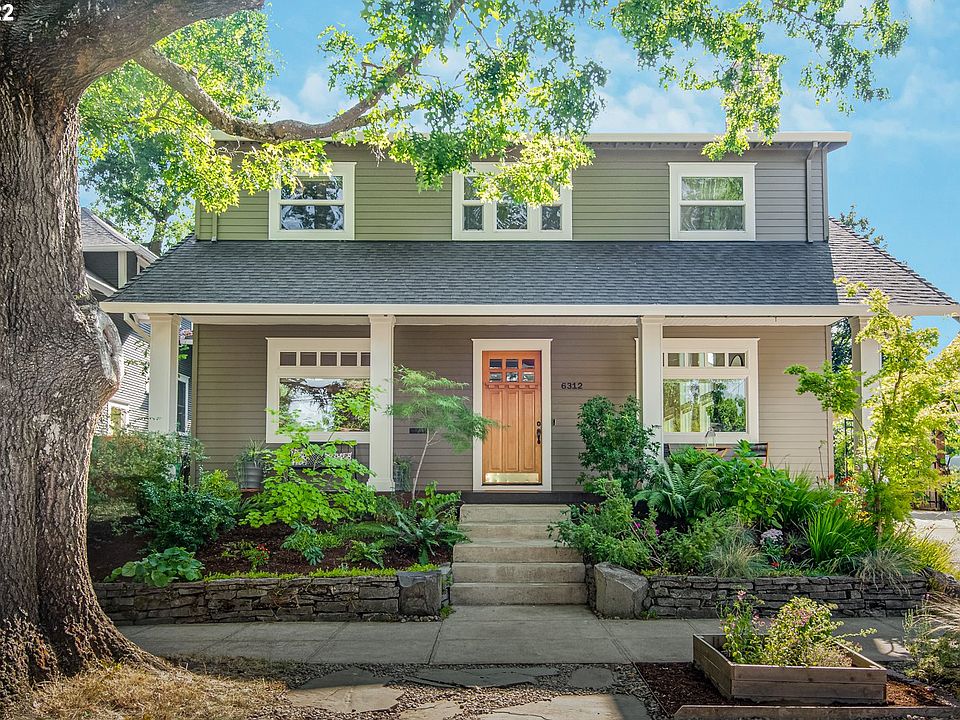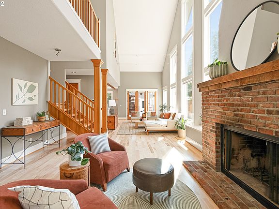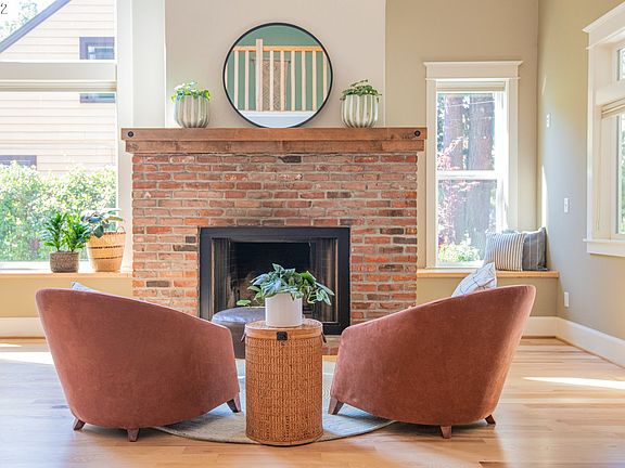 Custom-built modern lodge, flooded w/ light year-round from dramatic wall of south-facing windows. Exquisite high-end finishes: hickory floors, brick fireplace, tall solid-core doors, luxe tile baths, open kitchen w/ extensive storage, ample counter space. Rare main-level BR has adjacent BA w/walk-in shower. Oversized lot w/broad front porch, lush landscaping, private back yard w/cedar hot tub for spa experience. Blocks to restaurants, shopping, library, services. Offer deadline 5PM 8/14. [Home Energy Score = 4. HES Report at https://rpt.greenbuildingregistry.com/hes/OR10204328]
