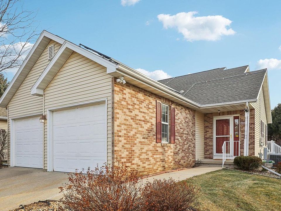 Back on the market! This 3 bed, 3 bath shared-wall duplex condo is bright, open concept, and in a fantastic eastside location! This energy-efficient home features SOLAR panels, gorgeous hickory wood floors, new carpet, vaulted ceilings with skylights, and 2 cozy fireplaces. The updated kitchen shines with stainless steel appliances, a tile backsplash, and granite counters. Enjoy the bright sunroom, patio doors leading to a composite deck overlooking green space, and plenty of storage. The professionally coated garage, new furnace, and AC add convenience and comfort. Move in and have lawn care and snow removal taken care of for you. New skylights being installed.