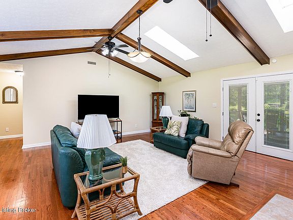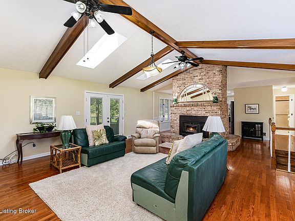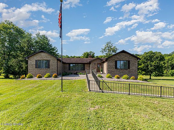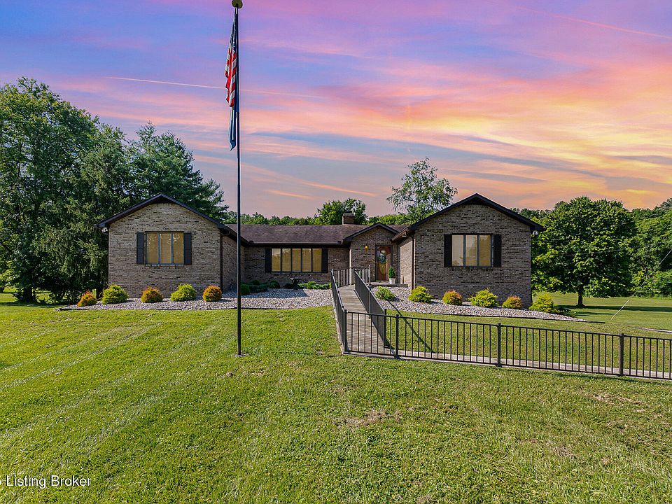 Picture yourself on 8.5 acres of peaceful countryside, minutes from the Parklands of Floyds Fork, Turkey Run —where every detail of this home works for you. Step inside to an open floor plan bathed in natural light and real hardwood floors. The first-floor split-bedroom layout gives everyone privacy: a spacious primary on one side, two bedrooms on the other, plus two full baths. Between them, a light, bright kitchen built for gatherings and a family room with soaring cathedral ceilings with timeless beams and a cozy fireplace creates the perfect hub for daily life. Downstairs, discover a private walk-out lower level designed for multi-family living: a cozy kitchenette, a fireplace-warmed great room, two offices, and another full bath. It's an ideal setup for college-age kids or in-laws The 2.5-car garage with a 220-volt outlet, invites your next big workshop project. Outside, a new Trex deck and covered patio overlook a nature-filled landscape complete with a fishing pondperfect for morning coffee or weekend hobbies. Sustainability meets comfort here, too: customized solar panels system with battery back up (pulling $0 electricity from power grid) powers the house and mini-split units in each bedroom give everyone personalized climate control. Completed with backup generator to keep house running if power goes out. This isn't just a property, it's a sustainable and energy cost-saving oasis where friends become family, work blends with play, and every sunrise feels like home.