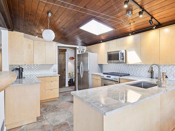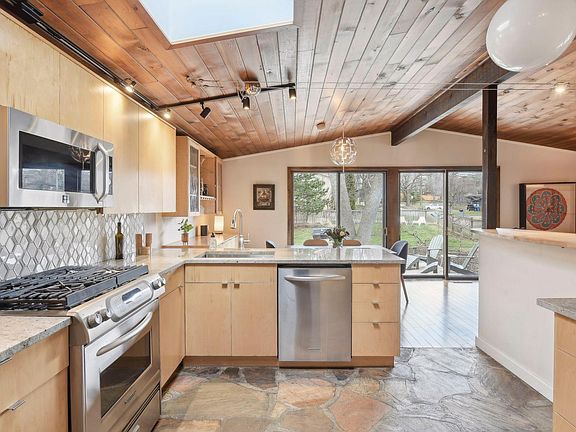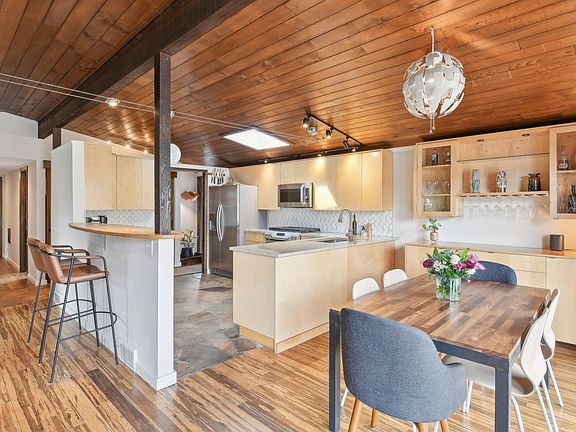 This early Lundgren Bros. mid-century modern is a true home of distinction. The vaulted open main floor boasts inviting living spaces and is adorned with natural woodwork and stone, walnut floors, and a stunning redwood ceiling. Morning and midday light pour in through large patio doors. The updated kitchen has loads of granite counter space, a breakfast bar and stainless steel appliances. Every bathroom has unique solid surfaces. The large fenced back yard offers a verdant getaway with ample privacy from surrounding trees; it is currently the domain of two of the happiest goldens I've ever encountered! The patio becomes a fantastic living space and features a built-in grill. Three bedrooms upstairs include a primary suite with ample space and en-suite 3/4 bath. The lower level has new carpet and paint and a 4th bedroom, plus updated 3/4 bath, wine closet, and tons of storage space. Newer Andersen windows, architectural roof and driveway. Pre-inspected by Structure Tech.