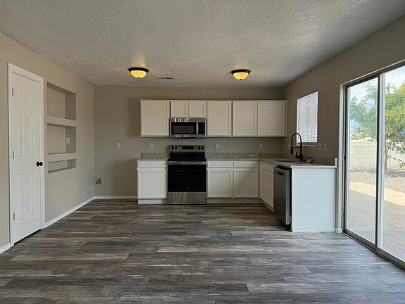 Centrally located 4 bedroom, 3 Bath, 2 car garage home centrally located in Rio Rancho. Functional floor plan features a spacious living area, all new flooring throughout, kitchen has new granite countertop, and stainless appliances. Master bedroom on main level. Refrigerated air, backyard access, mountain views, large backyard, and backs to open space with running trails.
