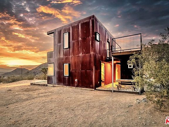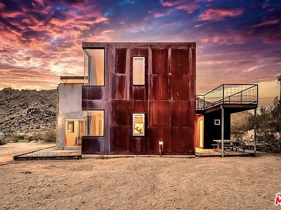 First time on the market: the prestigious Rotohouse, in the exclusive Monument Manor neighborhood of Joshua Tree, California. This organic architectural treasure is just a mile to the entrance of the popular Joshua Tree National Park, sitting between two large mounds of boulders enhanced by spectacular sunset vistas. House designed by world-class architect Michael Rotondi in 2007 and renovated over the course of 10 years. The main entrance is through a custom glass door entering a fun open-air atrium. The sophisticated floorplan incorporates 2 stories 1,845 sq feet, with 10ft. ceiling in the upstairs bedroom and 14ft. high opening on downstairs bedroom, three bathrooms, two in the master suite, his and hers. Characterized by simple forms and open volumes, the main addition is a cube 25 feet on each side. Adjacent to that is a long, narrow storage building with a roof deck pointing to a phenomenal spectacle of heaped rocks and sexy Pinto Mountains. Raw and handcrafted, the rugged exterior wrapped in corten steel set the trend for hi-desert buildings. Mondo central air eases extreme desert climate offering perfect comfort throughout. Every custom window frames extraordinary and enchanting wild desert scenery. The included adjoining 2.5 acre parcel is priceless on it's own. It offers the perfect location for a potential second epic dwelling; perhaps on piers, so as to offer infinite vistas east and west. With this purchase you are not just buying a house but the true character that inspires the Joshua Tree nature and lifestyle.