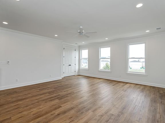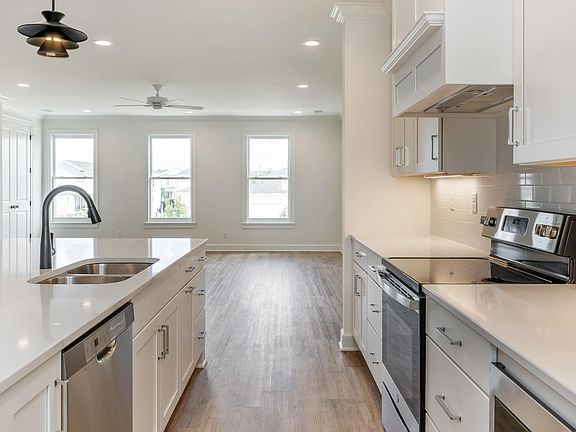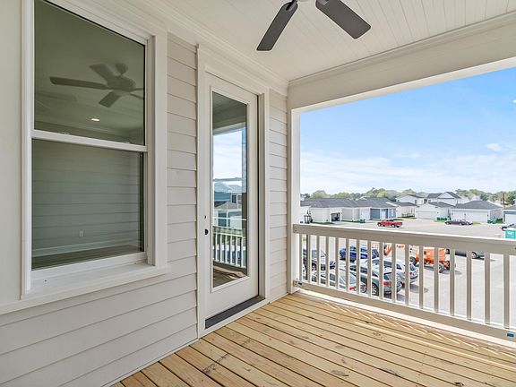 Townhome for rent in the heart of the Norton Commons North Village. 6314 Meeting Street, #202. Geothermal HVAC, 100 SF private rear balcony, rear parking lot for tenants and guest, no carpet, all wood and LVT flooring, stainless steel appliances, washer and dryer included, faux wood blinds included, Open living area, walk-in closet in primary suite, large tiled shower, ceiling fans with remotes in both bedrooms, outside, and in the main living area.