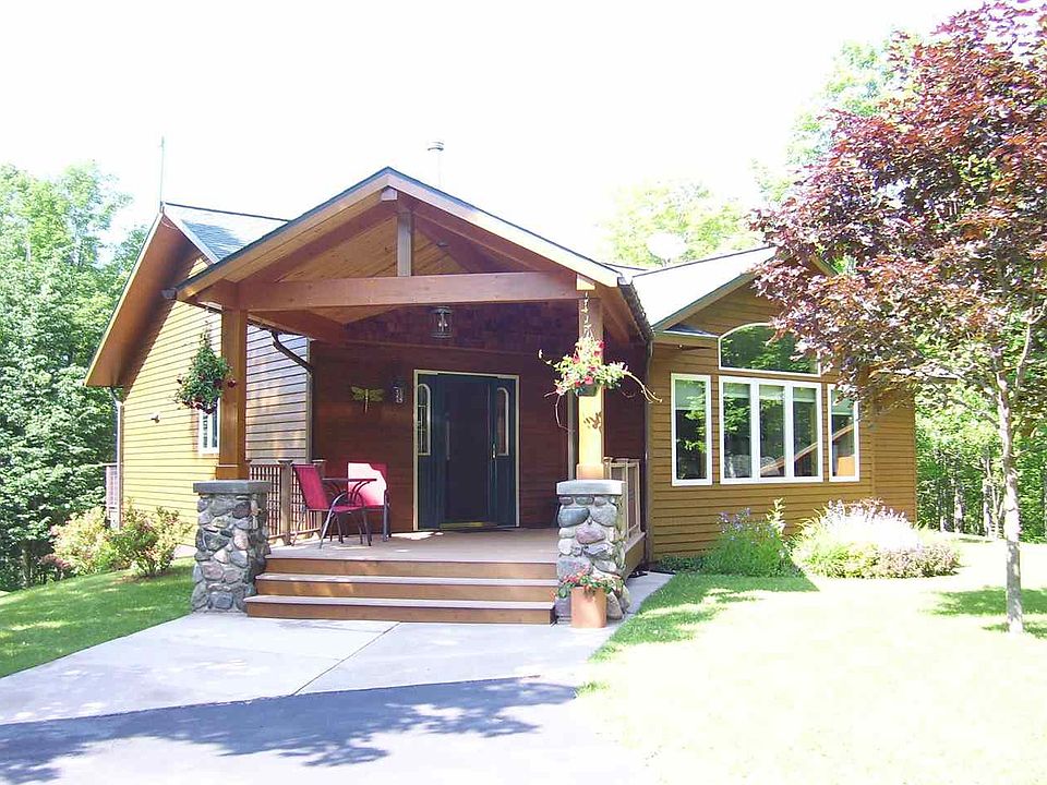 Quiet country location between Bessemer and Ironwood with close proximity to town and medical facilities. Grand covered deck entrance. Large ceramic tile entrance with staircase to lower level. Home is "Open Concept" with birdseye maple hardwood floor in the spacious kitchen with island having hickory cabinets. 16x34 living and dining with patio door to deck having a lovely view of the woods. A Jotul wood stove on a brick hearth will heat the entire first floor. Vaulted ceiling in the living and dining rooms. Master suite is the entire east side and is 13x28 with a bedroom, walk in closet, and full bath with vanity, linen storage, and modular tub and shower. The entire walk-out lower level is finished with 2 bedrooms having lovely views of the woods, family/rec room is carpeted with ceramic tile at the patio door to the covered patio; full bath is ceramic time, vanity, and 48" Shower. Sauna is cedar, laundry room, mechanical room, and office space finish this level. Outside you will find a blacktop drive from the street to the house. Detached 36x24 garage fits 2 cars with 2 overhead automatic doors, plus shop, pull down stairs to storage and all insulated and paneled. The 3 section storage building will house your wood supply, raised center section for storage, and the 3rd section has a concrete floor for additional storage. Property is nicely landscaped. Front covered deck entrance is no maintenance. Rear deck is treated. Cedar siding on home and asphalt shingle roof. Vinyl