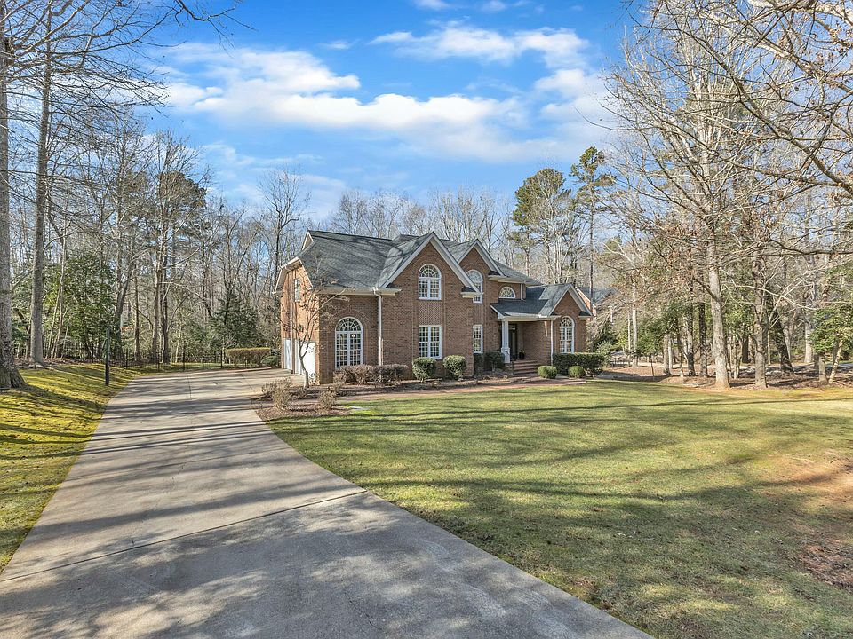 This luxurious four-bedroom, four-and-a-half-bath estate is nestled on 1.84 acres of serene, private land, offering the perfect balance of elegance and comfort. As you step through the grand foyer, you'll immediately notice the exquisite hardwood floors that flow throughout the entire home. To your right, an office provides a quiet space for work, while the formal dining room to your left is ideal for hosting elegant meals. The spacious living room is a true showpiece, with a focal fireplace wall and abundant windows that flood the space with natural light, all beneath soaring vaulted ceilings. The gourmet kitchen is a chef's dream, featuring Frigidaire Professional stainless steel appliances, including a six-burner gas range, a microwave, and an additional wall oven. Marble countertops enhance the beauty of the space, and a charming bay window in the breakfast area offers a cozy spot for morning meals. The laundry room also serves as a mudroom, with ample hooks and storage to keep everything organized. The primary bedroom suite, located on the first floor, is a luxurious retreat with a massive bedroom, tray ceiling, and another bay window that creates the perfect nook for an extra sitting area. The attached primary bathroom is equally impressive, offering a double showerhead walk-in shower, a double vanity, and two separate walk-in closets, each thoughtfully designed with custom built-ins to maximize storage. Upstairs, three generously sized bedrooms each come with their own attached bathrooms, ensuring privacy and comfort for all. A spacious loft area adds versatility to the second floor, featuring a wet bar area with mini-fridge and sink for convenience, as well as a separate billiards room with vaulted ceilings and built-in shelves, perfect for both relaxation and entertainment. The outdoor space is nothing short of spectacular, with a private backyard oasis that includes a massive deck and patio, perfect for entertaining or relaxing. The inground pool, surrounded by a privacy fence and lush trees, offers a tranquil and secluded environment to enjoy the outdoors in complete comfort. This estate is a true masterpiece, combining luxury, style, and functionality in a truly exceptional setting.