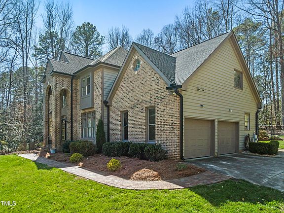 Stunning brick front home nestled on nearly 3 acre wooded property in prime North Raleigh location. Hardwoods throughout 1st & 2nd floors. Spacious family room features gas log fireplace. Formal dining room includes trey ceiling. Large 1st floor office with french doors. Recently renovated kitchen offers re-faced cabinets, granite countertops, updated appliances & tile backsplash. Sunlit breakfast room with extra cabinets. Fantastic primary suite boasts sitting area with fireplace, quartz top dual vanities, whirlpool tub with separate oversized shower (dual shower heads) & 2 walk in closets. Huge bonus room & office/bedroom with built-in bookshelves + full bath on lower level. Great storage space. Water filter & water softener. 2-tiered deck with panoramic wooded views. Firepit and storage shed. *** Property extends well past back fence line.