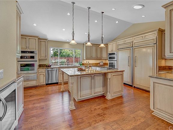 Exquisite 6 bedroom (three up and three down),4 bath Mabury Ranch beauty with welcoming curb appeal, totally open floor plan,an utterly remodeled kitchen,3 fireplaces,remodeled bathrooms,dual master bedrooms,extra large secondary bedrooms and a totally private backyard,all at the end of a wonderful cul-de-sac,feeding the incredible schools of Orange/Villa Park.Starts w/ lush front lawn,accented by stack stone pillars/facades & flower gardens,a quaint front sitting porch,then in through the gorgeous leaded glass front door.Step in to the expansive living room w/ soaring Cathedral ceilings,built-in cabinetry,romantic stone fireplace set off by rich hardwood flooring then into the open kitchen w/ a prodigious center island topped by top-of-the-line granite slabs,antique white custom cabinetry,easy close drawers,glass faces & pullouts.stainless steel appliances(Three dishwashers,two warmer drawers) including 6 burner stove top w/ retractable vent,built-in double wide GE refrigerator,pendant lighting,wine fridge, dual ovens,dual microwaves,dual S/S sinks,upgraded fixtures,spice drawers,large walk-in pantry,even butler pantry,highlighted by glass pocket doors between kitchen/living room.Upstairs bonus room is amazing w/quartz topped counters,mini fridge,Built in cabinets,fireplace,hardwood floors.Hallway bath has granite counters ceramic tile flooring & designer tiled shower walls.Upstairs Master & secondary bedrooms are utterly massive w/ both bathrooms nicely upgraded.A True GEM!