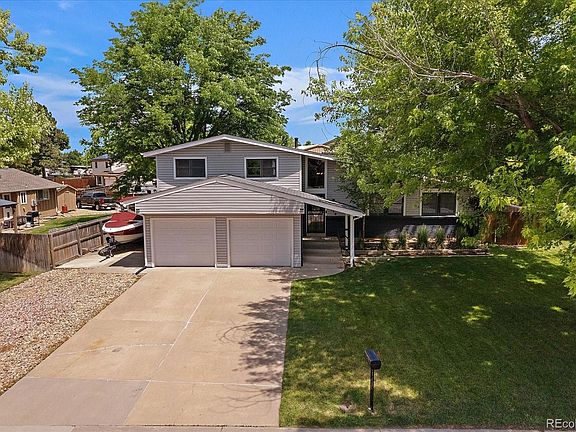 Welcome to an elegant and modern home in Littleton, offering ease of commute. This absolutely stunning residence boasts 4 bedrooms, 3 bathrooms, open and flowing living space, all situated in a quiet neighborhood, and a large lot with mature trees. Step inside to discover a breathtaking great room, updated throughout with detailed, modern finishes and high ceilings, creating a truly luxurious atmosphere. The kitchen is a chef's dream, featuring a rustic wood island with seating for 5, granite countertops, Wolf range, panel Bosch dishwasher, beautiful cabinetry, and a coffee bar, perfect for entertaining. The main level also offers an inviting living room and dual pane windows that flood the space with natural light. Enter the landscaped backyard and stamped concrete patio with two pergolas for outdoor relaxation. Upstairs you’ll find the calming primary suite, 2 additional bedrooms and an updated full bath. Venture downstairs to a laundry room with new appliances, half bath, and the 4th bedroom perfect for an office or guest room. A partial basement, ideal for storage or potential expansion is versatile for your needs. The property also features an attached garage and RV or boat parking. With a new roof, furnace, and heat pump. Heat pump and smart thermostat reduce monthly Xcel expense. this home is not only stunning but also efficiently updated. Don't miss the opportunity to make this exquisite property in Columbine Hills your new home.