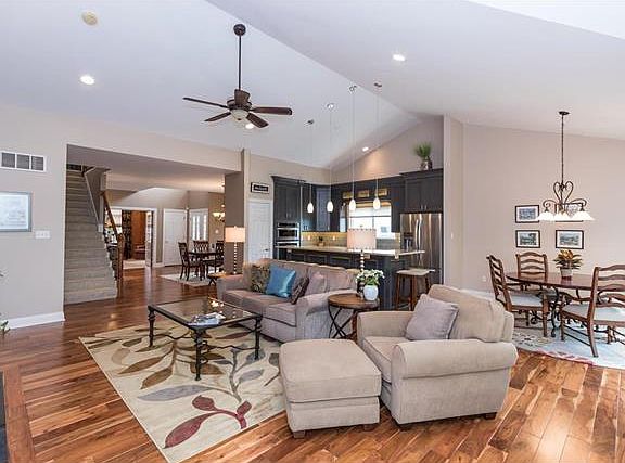 Masterful design and modern luxury are embodied in this Villa with approx. 3800 sq. ft of living space. Open floor plan perfect for entertaining with stunning views that back to woods. Every detail was carefully selected and quality crafted. Highlights include: 5" Brazilian hardwood flooring throughout main floor, Gourmet Chef's kitchen w/rich 48" custom cabinetry, Cambria counter tops,12 ft island, under counter lighting & dimmers, Upgraded appliances, & exceptional detail of crown molding. The Master bedrm is the ultimate retreat located on main complete with full height Plantation shutters, coffered ceiling and 9" crown molding. Entertain in grand style in your LL. Finishes include:custom cabinetry bar w/wine rack and refrigerator, fireplace & separate guest qtrs w/full bath. SO MUCH attention to detail of finish carpentry in this home. The Bluffs connects neighbors with a community pool, play grnds,volleyball, tennis, and golf course. The Legends "BEST VILLA" is calling you home !