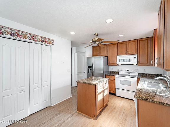 Welcome Home to Compass Pointe, a 55+ Gated community in West Melbourne. The home features an eat-in Island kitchen with 42'' maple cabinets & granite countertops. All appliances including washer & dryer. The master has a large walk-in closet, double sinks, and updated tiled shower. There is a great room open split floor plan with sliders leading to a trussed screened porch & private back yard with shade trees. Brand new laminate flooring & new carpet in the bedrooms. Other features include indoor laundry, storm shutters, & new roof in 2020. The community has a clubhouse, heated pool/spa, bocce ball, putting green, social activities & HOA provides lawn care. Short drive to shopping, restaurants & beaches. Time to sit back, relax & enjoy Florida.