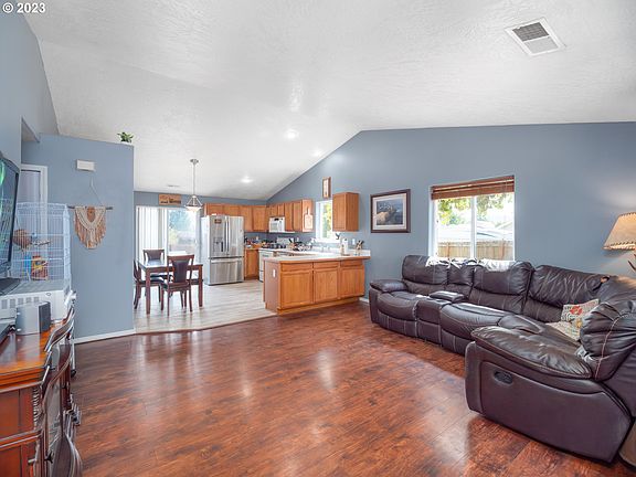 Nestled in a well-kept neighborhood of Roseburg's Green District, this stunning 3-bedroom, 2-bath residence is calling you to a life of comfort and style. With only one previous owner, you know this home has been loved and well taken care of since the day it was built. You'll be immediately impressed by the fresh exterior paint and mature landscaping that provide a welcoming ambiance. The spacious living room greets you with a tasteful tile entry, vaulted ceilings, and sleek laminate floors complimenting an open-concept living and kitchen area. Retreat to the master bedroom, complete with an en suite bathroom. From the convenient indoor laundry to the large, fully fenced backyard with raised garden beds and a delightful grape-laden trellis, every inch of this home has been designed with you in mind. The garage, equipped with a 220v outlet, is perfect for your power tools or for charging your electric vehicle. A haven for garden lovers, the generous backyard offers plenty of room for your creativity and relaxation. Schedule your private tour of this fine home today!