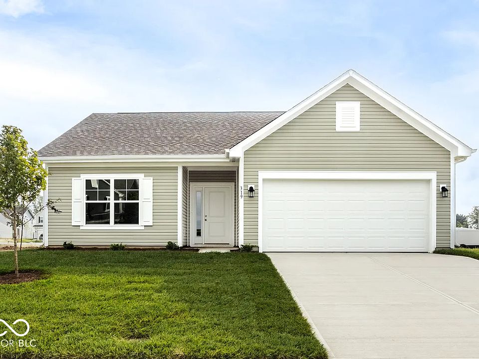 Welcome to your new home in Trafalgar, IN, featuring the Walnut floor plan and Elevation C, adding to the home's charming curb appeal. This 1,251 square foot ranch features 3 spacious bedrooms and 2 full bathrooms, providing the perfect layout for family living or entertaining. Step inside to find 9' walls on the first floor, creating an open, inviting atmosphere throughout the living areas. The heart of the home is the kitchen, featuring 42" tall straight upper cabinetry and a large kitchen island with a snack bar. The quartz countertops and stainless steel appliances complete the space, adding an elegant finish. Through the sliding door, relax or entertain on the generous 12' x 10' rear patio, ideal for outdoor living. The primary bedroom is a serene retreat, including a 60" framed bi-pass shower in the ensuite bathroom and a walk-in closet. The full bathroom in the hall offers convenience and privacy for the two additional bedrooms. Practical features like a water softener bypass rough-in and durable vinyl plank flooring in the common areas enhance the home's functionality. This home is designed to meet your needs with both style and convenience. Don't miss the opportunity to make this house your home!