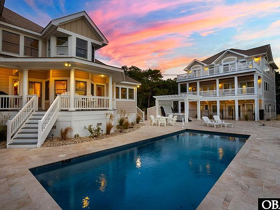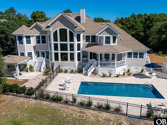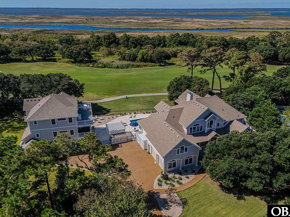 This extraordinary Corolla soundfront estate showcases 9 bedrooms, 11.5 baths plus an in-law suite, spanning a refined main residence and a newly constructed 2024 guesthouse. The main home offers four elegant master suites, a soaring double-story great room with floor-to-ceiling glass, a designer Wolf/Sub-Zero kitchen with adjoining coffee & wine room, a full gym, two private offices, and a dramatic owner’s retreat with spiral staircase, library, and oversized walk-in. The guesthouse adds four additional master suites, including two spacious family suites with private decks, a cabana kitchen opening directly to the pool, elevator, and a third-floor great room with fireplace and expansive deck. Outdoor living is unrivaled with a heated saltwater pool renovated in 2024, a 3,000+ sq ft travertine deck, two hot tubs, gazebo, and beautifully landscaped grounds ideal for gatherings of 100+. Sited on 1.19 private acres along the 9th green of The Currituck Club, the property features a gated fairway entrance, golf cart beach access with valet service, and walkability to the clubhouse, fitness center, and shops. Meticulously maintained and never rented, this is a one-of-a-kind year-round retreat that must be experienced to truly appreciate its magical setting and timeless allure.