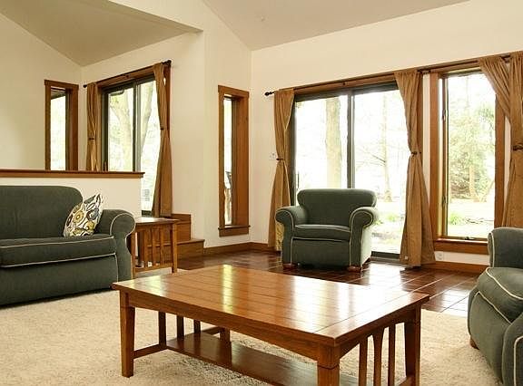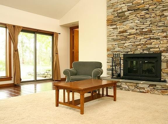 Stunning architecture with desirable open floor plan, new wood flooring, vaulted ceiling with dramatic stone fireplace in living room, open to loft on second floor. 1st floor master suite, 4 season sunroom with wood stove and granite kitchen counters. Large second floor attic storage room.