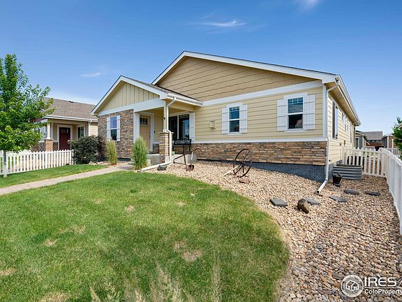 MOTIVATED SELLER! Impressive ranch home in Maple Ridge community, thoughtfully customized for ease of living and full of unique features. With its fenced front yard and inviting porch, this home offers picturesque views of the Rocky Mountains. Step inside to experience the spacious open concept layout, accented by vaulted ceilings that enhance the home's airy feel. The living area features a gas fireplace centerpiece with a custom handmade mantle, providing a cozy space to unwind. Day night shades on the windows allow for optimal lighting control and privacy, ensuring comfort at any hour. The kitchen is equipped with granite countertops, stainless steel appliances, soft-closing cabinets, and a pantry. An island with seating provides the perfect spot for casual dining or entertaining guests. Comfort extends to the primary suite, which features its own vaulted ceilings, an ensuite bathroom, and a walk-in closet. Two additional bedrooms offer plenty of space for family or can double as a home office or a hobby room. Adding significant value, the full unfinished basement with 9-foot fully insulated walls and rough-ins for a bathroom offers endless possibilities for additional living space, ideal for a recreational area or additional bedrooms for guests. Outside, two covered patios, one on each side, provide a sheltered space to enjoy the outdoors. The low-maintenance yard is supported by a 14-day programmable irrigation system, ensuring beauty without the burden. The fully insulated oversized garage offers extra space for vehicles and storage. Located close to local amenities, this home not only offers an ideal living space but also convenience at your doorstep. Recent upgrades include new Class 4 roof shingles and new gutters, installed in 2023.