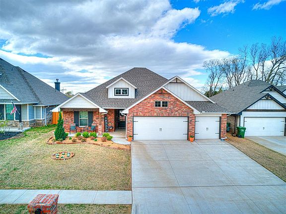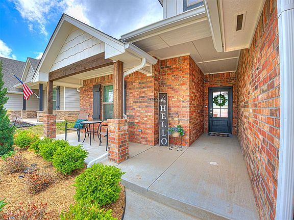 Waterfront lot offers spectacular views of the Oklahoma Sunsets from the covered back patio (with fireplace). This beautiful all brick home has great curb appeal & a large front porch as well. 570 Sq Ft, three car garage with storm shelter included! Post tension slab. Spacious Living Area includes a gas fireplace, a cathedral ceiling with a beam, and beautiful sliding barndoor. Kitchen includes 3CM quartz in the kitchen, decorative vent hood, upper cabinets to the ceiling, under counter lighting, and stainless steel appliances. Master Bedroom and bath include box ceiling with incandescent rope lighting, walk in master shower, jetted tub, and large walk in closet with 3rd row seasonal hanging. Outdoor living includes an outdoor fireplace, cable outlet, and underground sprinkler system. Fully fenced, with wrought iron across the back so that you can enjoy the open space and pond. Other amenities include Smart Home Technology, air filtration system, Rinnai tankless hot water heater, solar board, and R44 insulation help make this home energy efficient. The 4 bedrooms are spaced out to offer privacy to each one. The main bedroom closet has access to utility room.