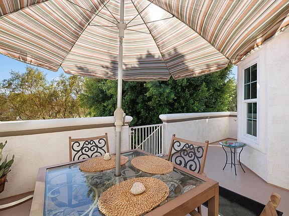 Sparkling, light and bright, 3 bedroom 2.5 baths upstairs Villas condo. This clean-as-a-whistle condo comes turnkey furnished and boasts several expensive upgrades. The flooring features large, diagonal set tile throughout the condo. The meticulously cared for kitchen showcases newer, stainless appliances as well as updated lighting. All windows have been replaced and the A/C replaced in Jan 2022. LED lights throughout, custom closets, self cleaning washer & steam dryer, instant hot water and extra storage. Ideal location with the rear balcony overlooking a greenbelt with an abundance of trees and close to the community pool (one of only two community pools in the Villas with bathroom facilities). The large front balcony includes a locking gate for privacy and to provide outdoor space for the fur babies. The large primary suite includes a walk-in closet and sliding door direct to the back balcony. This desirable floor plan offers a large junior ensuite with walk-in closet. The room at the front of the home is currently used as an office, but retains the closet so can easily be used as a guest bedroom. Homeownership includes 24hr guard-gated security, regular patrols, pickle ball, tennis, updated fitness facility with free weights, weight circuit, a variety of aerobic machines, and an exercise room. Desert Falls CC is ideally situated mid-valley with easy I-10 access. Close to groceries, retail, and dining. Short Term Rentals are Permitted in the Villas at Desert Falls.