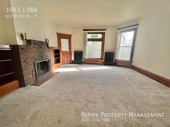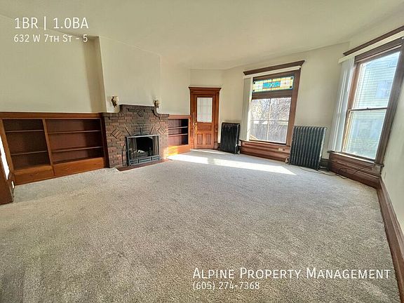 Call today to schedule a tour of this spacious ground floor 1 Bed apartment with tons of charm at 632 W. 7th St. #5 in Sioux Falls, SD! Located in the historic district this apartment has tons of character from the original build. The large family room features large south-facing stained glass windows and a stone fireplace (just for show) with built-in hardwood shelves surrounding! The vaulted ceilings make it feel even more expansive than it already is. There is a foldout dining table off the kitchen to help utilize the space, as well. The bedroom features 2 separate closet areas, one that is connected to your bathroom so you won't ever forget your bath towel! Other amenities include off-street parking, window a/c provided, garages for rent, and on-site coin operated laundry. - $50 application fee per adult - $745 security deposit - Tenants pay for electric - Landlord provides the heat, water, garbage, lawn/snow care! - Pet friendly(2 max) and non-smoking - Section 8 accepted if your voucher meets the marketed rent amount - Alpine Benefits included for $25/month extra (see website for full details) Professionally leased and managed by Alpine Property Management Garbage Heat Heat Water Garbage Lawn Snow Included With Rent!! Lawn And Snow Care Non Smoking On Site Laundry Online Tenant Portal Pet Friendly Show Fireplace Stove Tub Shower Water Window A/C Provided