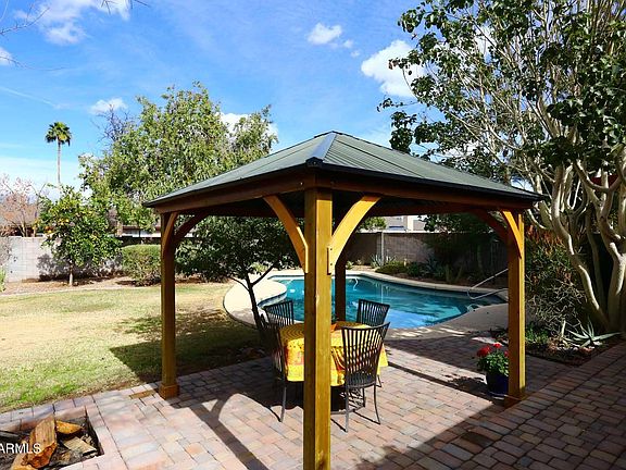 Gorgeous single level home with big front porch, -interior just painted, cleaned & ready to move in. The floorplan is perfect -Cozy step down front room with shutters & coat closet. Family room with fireplace & spacious area for dining. The airy kitchen features granite counters, newer SS appliances, picture window with back yard views, pantry & breakfast bar. There are 2 hall linen/ storage closets & 3 large bedrooms. The spacious back yard is so beautiful with paver patios, new pergola, grassy play area, cactus garden, citrus & shade trees, side yard storage & large sparkling pool. Many upgrades/replacements have been done throughout the years -windows, roof, A/C, exterior paint, all appliances, back yard hardscape, water heater,& more. NO HOA --Offer on this home today.