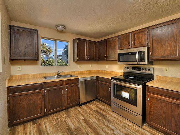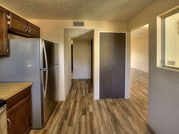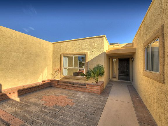 Perfect for your winter getaway or full time home, this charming townhouse has the location and upgrades you've been looking for. A large, bricked front courtyard welcomes guests and offers lots of space for flowers and desert gardens. Inside, the living space is small enough to be low maintenance, but large enough for entertaining family and friends. Updated with warm wood-look ceramic tile and fresh paint, the living/dining areas are open to each other. A slider out to the back patio allows an indoor/outdoor flow. The back patio has peek-a-boo mountain views and no houses behind you! The kitchen is adjacent to the living areas and has rich dark cabinetry and sparkling new stainless appliances. Your master suite features sliding glass doors out to its own patio. The master bath has a walk-in shower and has been been updated with a new vanity. The guest room and bath are spacious and have also been updated with new flooring and a new vanity. Located in the center of town, and within walking distance of the weekly farmers market and major shopping, this home offers all of the convenience of a modern desert lifestyle!