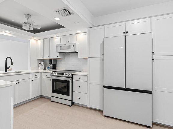 Beautifully renovated 3 bedroom, corner residence in The Glens condominium. Amazing views of the Via Mizner Golf & City Club Golf course (no membership required). Impact windows sliding glass doors. Wide open kitchen with white cabinets, quartz countertops and stainless appliances. Both bathrooms renovated with new flooring, custom vanities and tile showers (hall bath has decorator tub). Long, wide plank flooring. Large balcony with new screening and easy access through sliding glass doors. Large utility room with full size stackable washer & dryer. The Glens has a beautiful clubhouse with pool, hot tub, exercise room and shady veranda that looks out to the lake and golf course. Central Boca location close to shopping, dining and entertainment. The beach is a short drive away!