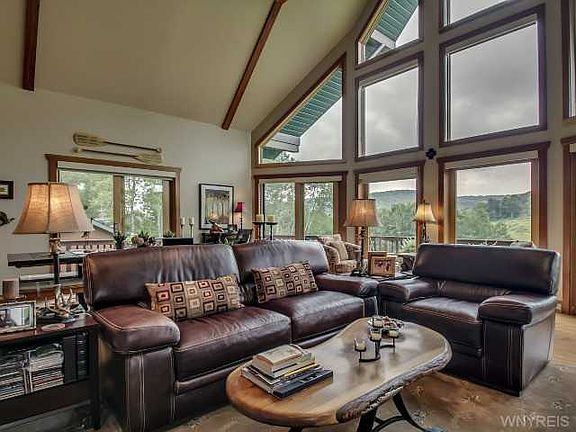 Unique ski country retreat! The home proudly overlooks a park-like setting w/ pond & sweeping view of the hillside. 25-acre setting is wooded w/ hiking trails. Huge deck to sit & watch the seasons change. Great room has cathedral ceilings & field stone fireplace. Gourmet kitchen has breakfast bar, granite counters. Family rm w/ entertainment center. Large loft. Master ste has own bath. Beautiful hardwood floors throughout. Downstairs has full bath, 2 bdrms & bunkroom that sleeps 6. Just 8 minutes to HoliMont, Ellicottville, Holiday Valley. A must see! Furnishings & app. all excluded.