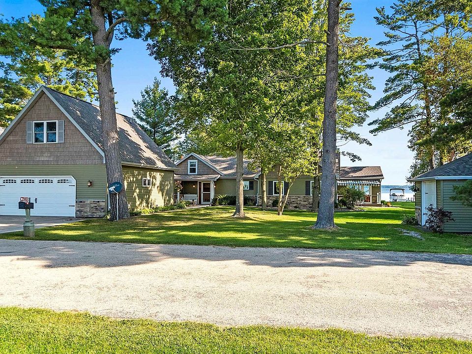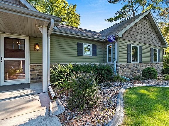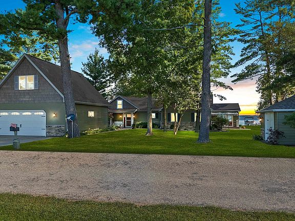 This luxury year-round 4 bed/2bath waterfront home is a must see! With breathtaking, open concept cathedral ceilings, fireplaces, a stunning sunroom, large dining room & kitchen all overlooking the big prize, 101 feet of pristine Shawano Lake sand frontage! Among the list of amenities, this pristine beauty also has a floor to ceiling stone fireplace, in-floor heat, in-wall speakers, rear deck & front deck with a retractable awning, cypress flooring, Italian look tiling, hickory cabinets & LED under cabinet lighting. The detached garage house's the overflow of guests as this offers a full bath with a stunning 320sf bunk house above the garage! All of this with Shawano Lake, Washington Lake & the Wolf River at your back door! Absolute serene living, welcome home! *PreAppr required to show*