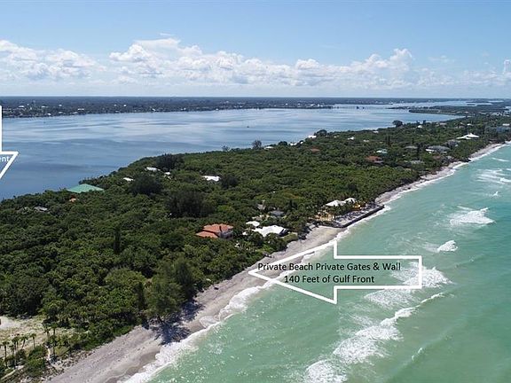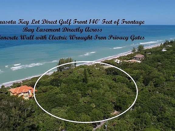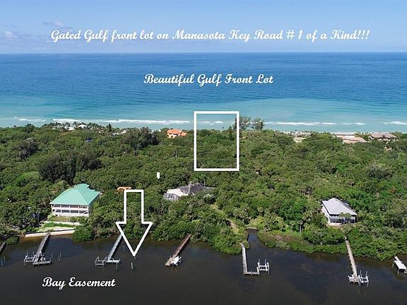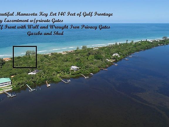GATED GULF FRONT LOT IN A MOST PRESTIGIOUS area of other Manasota Key Gulf Front Residences! THE ONE PLUS ACRES with 140 Ft. of water frontage offers you both privacy and luxury!!Build your own ultimate waterfront retreat with glorious seascape views and complete privacy! A Generous parcel to build a main home and guest quarters with a large pool or tennis court!! A rich diversity of island vegetation with tall palms, beautiful oaks and lush low vegetation. An easy canvas of natural landscape to nestle your sand castle within. The lot is currently characterized by a high concrete wall and wrought iron entry gates with pavers along the way to a free standing gazebo. Come by and sit a while and enjoy this magnificent and highly unusual parcels views and dream of your own oasis. There is also a 3 Ft. private easement to the bay directly across from the property. Close to restaurants and shopping. Two entrances onto island.