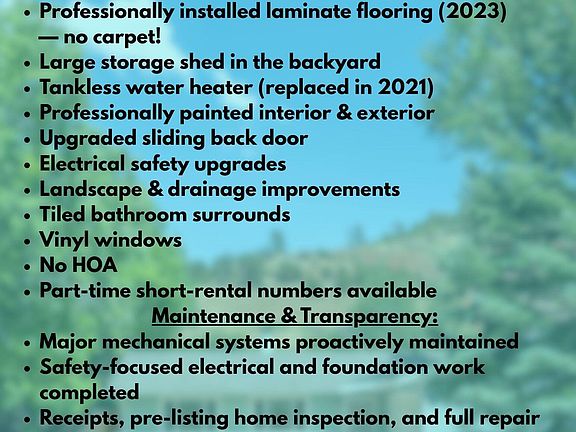 Beautifully upgraded and move-in ready, this single-level home in Flagstaff's desirable Smokerise subdivision offers 3 bedrooms, 2 stylishly updated bathrooms, and 1,430 square feet of thoughtfully designed living space. Enjoy new continuous flooring throughout the home, fresh interior and exterior paint, central A/C (a rare perk in Flagstaff), and a newer tankless water heater. The spacious kitchen with breakfast bar opens to a welcoming great room with a wood-burning fireplace, perfect for cozy nights or entertaining. A large laundry room with storage, while the fully fenced backyard features mature trees, low-maintenance landscaping, and a generous storage shed. The attached 2-car garage provides secure parking and extra storage. With over 70k + in seller home improvements including upgraded electrical (saftey), new slider door, and extensive stone landscaping this home blends comfort, efficiency, and charm. Located minutes from parks, trails, shopping, dining, and freeway access. Furniture may be available with a separate Bill of Sale. Part-time rental numbers available.