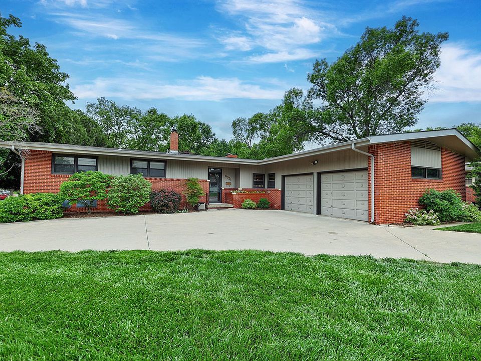 MID CENTURY MODERN HOME with completely remodeled KITCHEN and BATHS! Kitchen features gas top range, double ovens, built in microwave. Nice sized island for visiting with your friends while you prepare meals. Side load garage and a circle drive for extra parking and easy in/out from 8th street. Beautiful wood beams in the living room and formal dining room with a 10 foot limestone fireplace. Exquisite large windows. New furnace! Roof has been inspected and in great shape! Private fully fenced back yard with a covered patio and a calming peaceful water feature. Washer and Dryer in basement OR on the main floor off the kitchen! You get to decide.