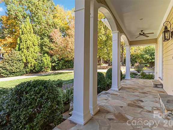 Welcome to a stunning single-family residence on over an acre of land, nestled in the heart of South Charlotte. This expansive home offers a perfect blend of elegance and functionality, ideal for both relaxation and entertaining. At the heart of the home, the kitchen offers ample space for culinary enthusiasts featuring custom wood cabinetry, high-end appliances, large island, and eat-in dining area. The formal dining room is perfect for hosting dinner parties, while the living room features oversized windows and doors out to covered porch overlooking serene and private backyard, a cozy stone wood-burning fireplace with gas igniter, and built-in shelving. The primary suite features large windows overlooking private backyard and entrance to covered porch, dual walk-in closets, a spa-like ensuite bathroom with a separate shower and tub, and a large custom double sink vanity with tons of storage. Dual walk-in closets provide generous storage space, adding to the home's practical design. Additional features include an additional bedroom on main with ensuite bathroom, a detached 3-car garage with huge attic space above for extra storage, workshop, or could become additional finished space. The expansive outdoor spaces are a true delight, with a private patio and yard, beautifully landscaped with a garden and lighting. Enjoy leisurely afternoons on the porch or entertain guests in the spacious backyard, perfect for outdoor gatherings.