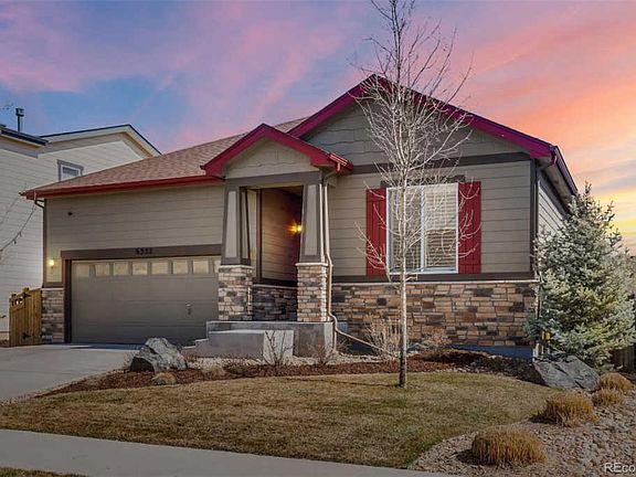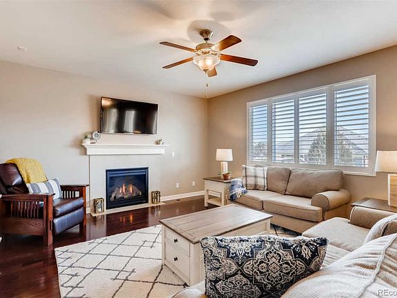 Richmond Alcott Ranch... former model home! West facing with mountain views! High-end custom finishes throughout including plantation shutters and stunning hardwood floors. Awesome floor plan is absolutely perfect for entertaining. Gourmet custom kitchen complete with huge center island, stunning granite countertops, double ovens, gas range, built-in speakers, walk-in pantry and gorgeous new light fixtures. Kitchen opens to beautiful living room with fireplace. Private Dining room. Main floor laundry. Coffered master suite has dual sinks and oversized shower. Generously sized master closet. Very spacious secondary bedrooms convenient to full bath with double sinks. Downstairs, enjoy a top notch recreation room/gameroom. (ping pong, basketball game and foosball table included!) Family room perfect for cuddling up and enjoying movies. Cozy fourth bedroom with walk in closet, right next a 3/4 Bath. Perfect for guests or teen. You'll also be spending a lot of time outdoors. Backyard has plenty of room for barbecues and fun! Covered back patio with custom built-in bar and grill! BRAND NEW ROOF in 2020. Home still feels brand new. Hurry, a ranch of this quality and style is rare! Award-winning Erie school district. Short bike ride to brand new K-5 Grand View Elementary! Fantastic neighborhood pool.