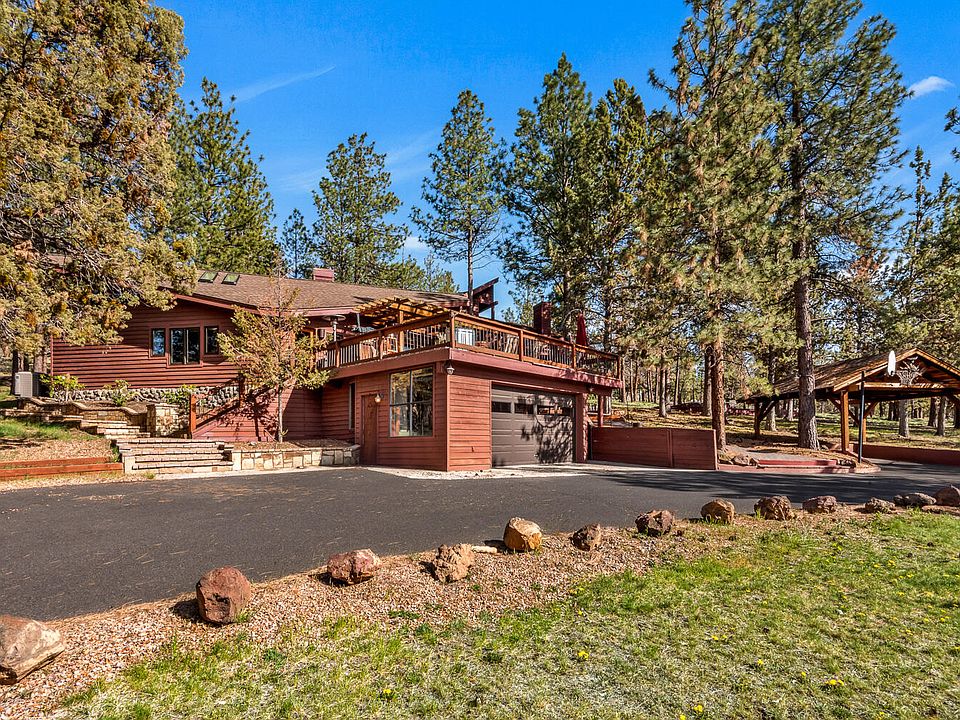 Experience the warmth of natural light, reclaimed regional wood, and panoramic Cascade Mountain views in this one-of-a-kind architectural home on over 3 fully fenced, gated acres in NW Bend. Tucked among the pines with a massive pull-through driveway, this private estate features split-level living, spacious rooms, updated bathrooms, and a newer roof. Enjoy vast outdoor living spaces with multiple decks, private courtyards, and a detached studio ideal for creative or flexible use. The oversized garage offers room for all your gear, with space to park your RV, boat, or other toys. No HOA or CC&Rs. Minutes to Shevlin Park, Downtown Bend, and westside schools, with trails, nature, and mountain views at your doorstep. Over $400k in home improvements by current owner.