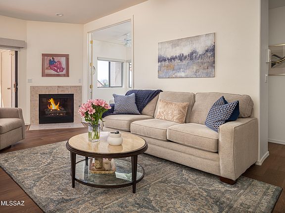 2BR/2BA 1ST floor 1,095sf condo in desirable guard-gated La Paloma community. The open floorplan welcomes you with a cozy fireplace in the living room where natural light pours in through sliding doors that lead to private patio, while elegant double doors open to the bedrooms, enhancing the feeling of spaciousness throughout. Serene patio offers one of the best locations in the complex offering mountain vista, desert & golf course views. Bright, cheerful kitchen has big window that brings in lots of light & features a closet pantry, granite counters, upgraded cabinets w/pull-outs & lots of workspace. Convenient laundry closet off kitchen. Spacious owner's suite is a true retreat, w/sliding door that leads to patio & walk-in closet. The split floorplan ensures privacy, w/roomy guest bedroom w/its own walk-in closet & ensuite bath. Attached 1 car garage. HOA covers a variety of maintenance & utility expenses such as street maintenance, gated community security, trash removal, water/sewer, pest control, roof maintenance, exterior upkeep & blanket insurance, community pool/spa & clubhouse. A perfect location near gourmet restaurants, upscale shopping, La Encantada Mall, Plaza Colonial, Exquisite Art Galleries, AJ's Purveyors of Fine Foods, an upscale gourmet market, Golf & Westin La Paloma Resort.