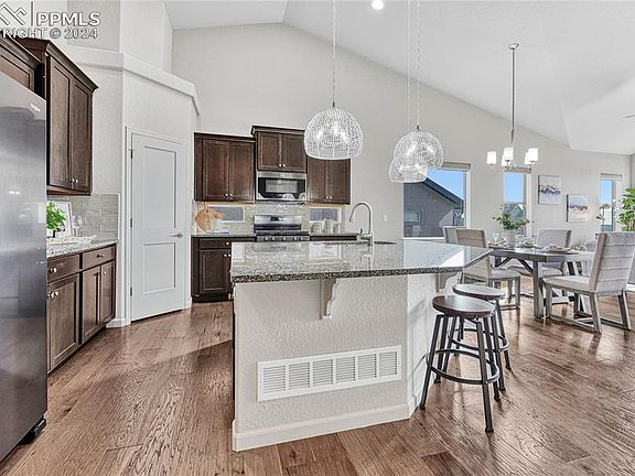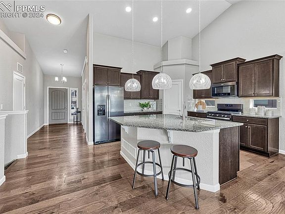 This semi-custom ranch style home boasts 3,414 sq ft/4BD/3BA and Pikes Peak views! The 3-car tandem garage is sheet rocked, heated and offers abundant shelving. Enter from the welcoming covered porch to updated flooring and 9 ft and vaulted ceilings throughout the house. The great room features several windows with electric blinds, a double-sided stone gas fireplace, ceiling fan and walk-out to the composite wood deck. The kitchen boasts an expansive island, granite countertops, walk-in pantry, feature lighting and gas range. Refrigerator included! The main level primary bedroom features mountain views, electric blinds, a walk-in closet, ¾ bath with double vanity and large walk-in shower with window. A second main level bedroom, featuring 3 windows with plantation shutters, would also make a fantastic home office. The adjacent full bath makes this an especially nice accommodation for guests. The washer and dryer are included in the laundry room, which also offers garage access. A great “dump” area! Head downstairs to the impressively large family room, pre-plumbed for a wet bar, and 2 windows with plantation shutters. Rounding out the basement are 2 bedrooms, each with plantation shutters and one with a walk-in closet, a full bath with granite countertop and a storage room. Enjoy the convenient access to dining, shopping and entertainment including walking distance to parks and Wolf Lake, access to the Powers Corridor in 5 min. and 10 min. to I-25.