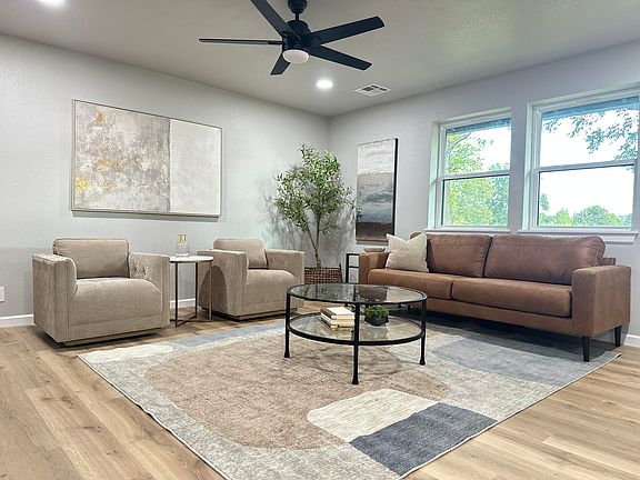The kitchen is spacious with a large island, bar-top seating, quartz countertops, subway tile backsplash, new stainless steel appliances, and plenty of cabinet space. It opens into the dining and living areas, making it ideal for gatherings. Neutral colors and luxury waterproof plank flooring run throughout the home for a bright and cohesive feel. The primary suite offers a walk-in closet and an ensuite bathroom with double sinks, generous cabinet space, and a walk-in shower. All three bathrooms include quartz countertops for a clean, timeless finish.