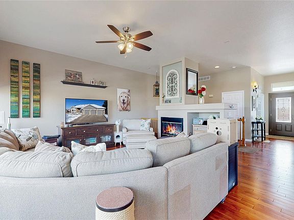 Discover exceptional craftsmanship and meticulous upkeep in this 6-bed, 4-bath ranch in the sought-after Fieldstone community. With 4,573 square feet of well-designed living space, this home blends comfort and functionality with easy access to trails, parks, and downtown Golden. The open floor plan features rich acacia wood floors, high ceilings, and Marvin windows, creating a bright, airy ambiance. French doors lead to inviting outdoor spaces. The kitchen, with its granite countertops, premium appliances, and ample cabinetry, flows into the family room, where a gas fireplace adds warmth. The primary suite is a private retreat with a tray ceiling and large windows. Its spa-like ensuite bath includes a frameless glass-enclosed shower, soaking tub, dual vanities, and rich wood cabinetry. Unlike most surrounding homes with partial basements and 8-foot ceilings, this home features a full basement with 10-foot ceilings, creating an expansive lower level. A custom bar/kitchen is designed with dark wood cabinetry, custom lighting, and generous seating. Two basement bedrooms have private ensuite bathrooms, ensuring comfort and privacy for guests or multigenerational living. Each bathroom features quartz countertops, stylish tilework, and contemporary fixtures. Recent upgrades include Jellyfish exterior lighting for programmable accent lighting, a 50-gallon water heater, Renewal by Andersen front door, and custom window coverings. The home also has a newer roof and fresh exterior paint (2024). Fujitsu mini-splits provide precise climate control. The back deck offers expansive eastern views with no immediate neighbors behind. Paver patios on each side of the home provide additional fresh air living spaces. A 3-car garage completes the home’s balance of style, comfort, and practicality. View the 3D virtual tour at https://rem.ax/6326Umber1 and schedule a private showing of this rare opportunity today!