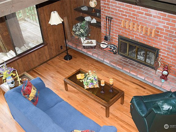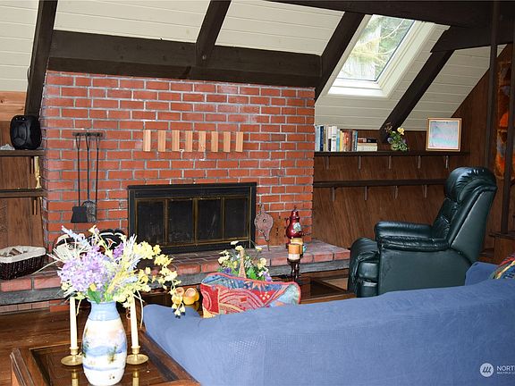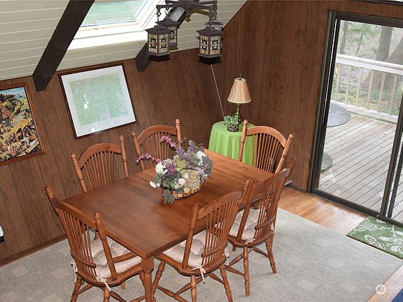 Nature at your door step surrounded by greenbelt and trail leading to the river. Well built with open floor plan. High, vaulted ceilings with large windows brings nature indoors. Spacious living and dining rooms with wood burning wood fireplace insert. Main floor bedroom accommodates queen sized bed and furniture. Great light with on of the 7 skylights plus window. Three quarter bath on the main floor and Half bath off Primary bedroom on the upper level. Lots of light and room up here too. Kitchen with bar eating space plus the table seats8-10 people make this a great gathering place. Main floor laundry with W/D and utility sink. Large deck expands the living space overlooking nature. Detached shop for hobbies plus large wood storage shed.