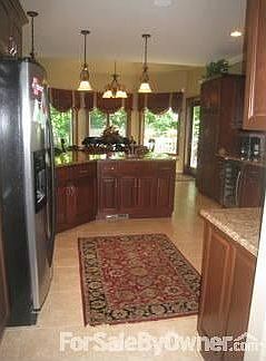 Covered entry opens to roomy foyer and beautiful backdrop of large windows overlooking wooded back yard. Great Room has vaulted cathedral ceiling and deluxe fireplace. Custom trim throughout house. Open floorplan with 2,548 sf on main level featuring cherry cabinets, granite counter tops, stainless appliances, wine refrigerator, and brazilian cherry hardwood floors in foyer and formal dining room. Large master bedroom with tray ceiling, his and her walk-in closets, large bathroom with ceramic double head shower and jetted 6' tub. Three bedrooms and 2.5 bathrooms on main level.Open staircase to 2,527 sf walk-out basement (2,100 sf finished + 427 sf storage room) with cherry bar-kitchenette, fireplace, private wine cellar with seating for 4, open living area for TV, billiards, and game area. Lower level has large guest master bedroom/ bathroom with optional 5th bedroom currently utilized as toy/exercise room (rough plumbing complete for additional full bath).