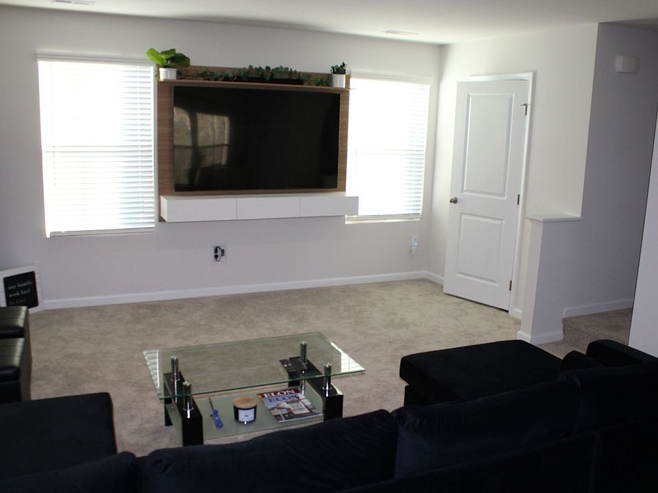 Main level features large, open great room, spacious dining area, and beautiful kitchen with stainless steel appliances. Great room includes 70 inch Samsung smart TV, gorgeous TV mount with storage, and half bath.