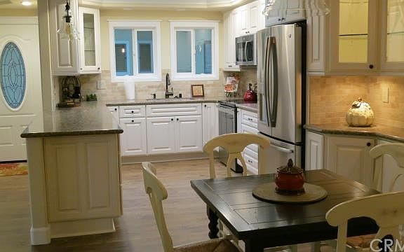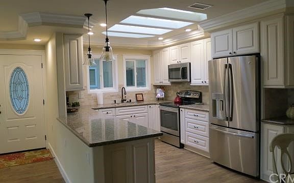 Top of the line quality remodel from top to bottom! No detail missed in this fabulous Casa Linda! NO STAIRS and very close to carport parking. Popular "close to creek" location. From the minute you enter through the leaded glass front door you can't help but notice this home has been totally transformed! Check out the new open floor plan in the living and kitchen area with additional cabinets now in the dining area for built in extra storage. Lovely upper covered balcony with cool breezes along with sunset and treetop views. Upgraded vinyl plank flooring with neutral tones throughout. Raised panel doors; closet doors mirrored on both sides swing out. Lots of natural light from large skylights in kitchen and bathroom. All this in Orange County's premier 55+ community of Laguna Woods. Enjoy golf, tennis, swimming along with many other amenities plus over 200 clubs and organizations within this gated community. Just a few miles to Laguna Beach with art galleries, shops and restaurants galore! And don't forget miles of beaches to swim, relax and explore...