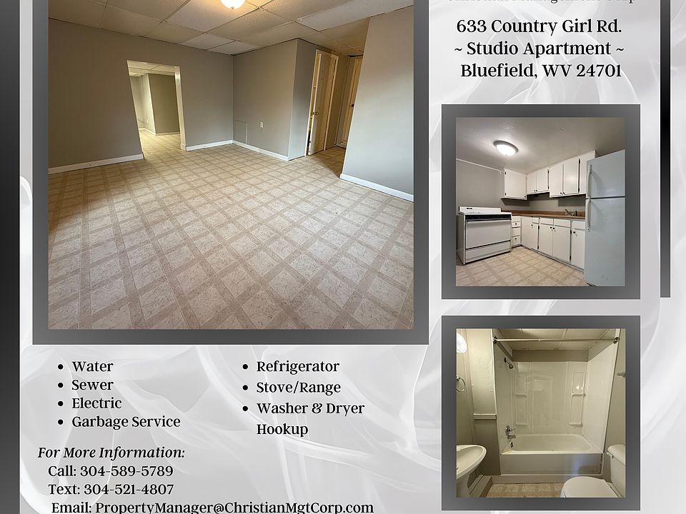 633 Country Girl Rd. ~ Studio Apartment ~ Bluefield, WV 24701 RENTAL ONLY: Security Deposit: $675. Can be made in payments if needed. Monthly payment: $675/month. All utilities included. ALL utilities included water, sewer, trash & electric! One bedroom, one bathroom apartment for rent. In a small building with no apartments above, below or to one side. You only have one neighbor! Located right off of 460 near Mercer Mall in the Greenvalley area. Plenty of paved parking. Covered front porch. Located on a dead end road. Very quiet & private! Large living room with laundry room with a washer hook up. Furnished with stove and refrigerator. New paint throughout entire apartment. Electric baseboard heat. Move in today! Christian Management Corporation Office Hours: Mon-Fri 9:00AM-5:00PM & 10:00AM-2:00PM the 1st Saturday of every month You can view THIS property 7 days a week! Most pets welcome with a $300.00 pet fee per pet and signed pet agreement. Maximum 2 pets. No aggressive breeds due to insurance restrictions. Clean, safe, quiet, crime & drug-free are our priorities for our residents! We support Equal-Housing Opportunities! Good people with good, bad, low, or no credit but stable employment or Social Security are welcome. -MUST pass background check -NO evictions in the last 7 years -NO sex offenders Is this property not what you are looking for? View our other available #homes, #mobilehomes, #apartments, and more on our Facebook or our website!