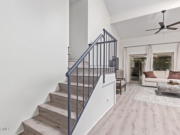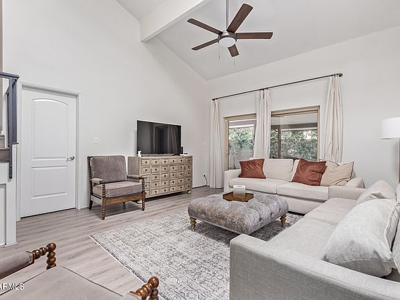 Stunning 3/2.5 split floorplan in a perfect location for someone wanting access to all the city has to offer while being tucked into a beautiful community. Vaulted ceilings, gorgeous lighting, and updated features throughout including plank flooring, fresh paint, new granite counters, backsplash, and high end stainless steel appliances. The primary bedroom offers backyard access, private bathroom, and walk-in closet. Upstairs bedrooms each with a balcony. Backyard features covered patio perfect for hosting a BBQ or outdoor events. Bonus front room can act as an office, a second living room, formal dining room or playroom. Attached 2 car garage. This quaint community offers a pool to cool off year around. Perfect for someone wanting a beautiful home without the maintenance of a big yard.