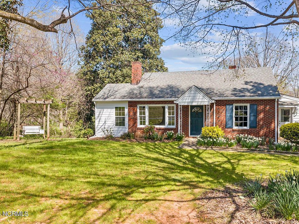 Storybook 3/2 brick cottage with finished basement nestled within the rolling hills of idyllic Cedar Grove Township in Asheboro. Home situated on private .54-acre lot with mature trees and landscape. Gleaming hardwood floors throughout main living areas and bedrooms. Sun filled living room with large picture window and wood burning fireplace with built-in shelving. Sunroom off living room with new luxury vinyl wide plank flooring with mounted flat screen TV. Full bathroom and 3 bedrooms/rooms (one large enough to be used as an office or den) on the main floor. Kitchen features cozy eat-in area equipped with stainless steel refrigerator, range, microwave, and new dishwasher. Tiled laundry area off kitchen. Newly refinished large basement with closet and full bathroom with luxury vinyl wide plank flooring and wall-mounted flatscreen TV. The home is heated/cooled with a gas pack supplied by natural gas. Conveniently located to US 64 and Hwy 73. Asheboro City Schools.