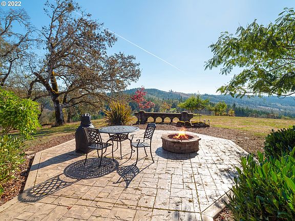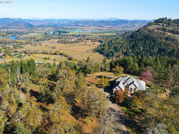 Immerse yourself in the beauty of the Umpqua Valley with this stunning Georgian style home, nestled atop 80 acres in the heart of the Umpqua Valley. Enjoy panoramic views from your beautifully stamped concrete back patio. High ceilings and hardwood floors. Sitting room/formal dining room. Bonus/office/hobby room. Main level primary suite, soaker tub, tiled walk in shower and closet. Has UBW + well for yard and garden. Shop w/den & full bathroom. Generator h/u's. Nearby vineyards & recreation.