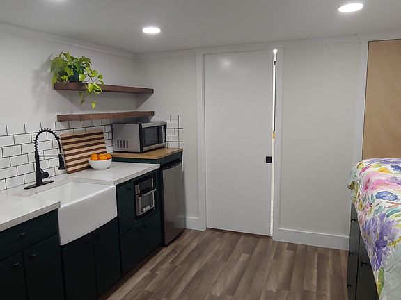 ALL UTILITIES INCLUDED IN RENT Luxurious Micro Apartment Beautifully renovated modern tiny apartment. Custom built-ins maximize storage, function, and usability of the space. Semi-furnished with lofted Queen bed frame /chest of drawers underneath for ample storage. Private covered patio looks out over secluded, quiet creek- doubling living space in the warmer months! Perfect for a grill or propane fire pit. Custom finish and trim throughout, including completely custom kitchen with large farmhouse sink, small fridge freezer, convection oven/air fryer, microwave, halogen stove top, ample storage and open shelves. Small portable washer/dryer included. Durable engineered hardwood floors. Basement suite apartment located on a flag-post lot - very private. Walking distance to quaint downtown Newberg (~15min) and George Fox University (~17min). ALL UTILITIES INCLUDED IN RENT (water, garbage, wifi, electricity, sewer). Absolutely no smoking or vaping anywhere on the property. Pets considered on case by case basis. Parking available on the street. Rent due on the first of the month via VENMO, check, cash, or paypal. Rent will be prorated depending on move - in date. Security deposit can be paid in installments over 4 months.