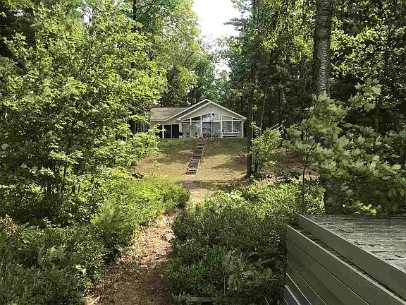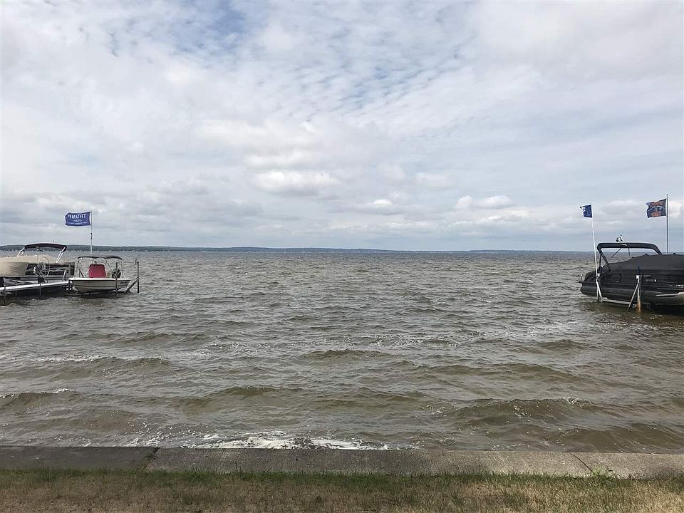 Pristine conditioned Lake front home located on Old Trail a revered and very high end road. Cathedral ceilings with T and G light pine trim, open floor plan with an brick fireplace. Separate dining room, comes with 2 large bedrooms, possible master bedroom suite with change of furniture and adding closet, currently used as a family room. 6x8 room off of master bedroom with an already attached city sewer could be a possible bathroom! Home is perched high on a hill over-looking the eastern shore line with beautiful sunset views. Paved drive goes into a large finished garage. Great for toys. Seawall. Dock. included. Stunning.