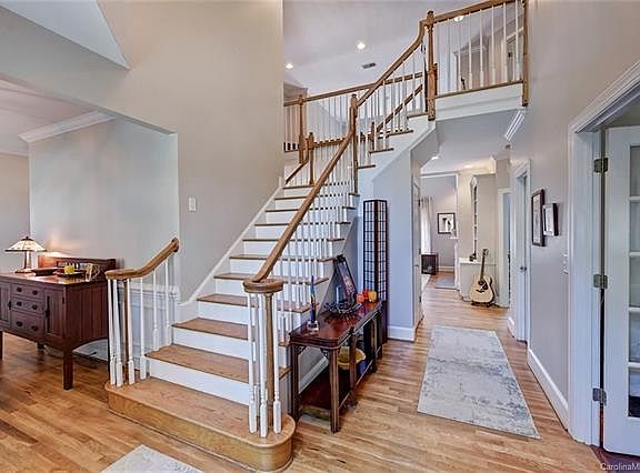 Beautiful custom built home in Pine Island. Convenient to downtown Charlotte, US National Whitewater Center and Pine Island Country Club. Very private flat wooded lot. Fenced in backyard. Large raised terrace patio with outdoor fire pit overlooks wooded fenced in backyard that adjoins a wooded natural area. Stunning vaulted foyer w/elegant custom staircase. Well appointed formal living and dining areas with custom molding and cabinetry. Vaulted family room with custom built-in cabinetry and back stairway open to Kitchen and eat-in area. Gourmet kitchen with large island, solid surface countertops, and large pantry. Hardwood floors. Family room adjoins private outdoor terrace. Work out room/office. This home is casually elegant and is perfect for entertaining. Spacious owners suite with massive walk-in closet and entrance to private deck overlooking backyard. Owners bathroom w/ separate tub and shower. Double vanities and private water closet Large guest BR's with ample closet space.