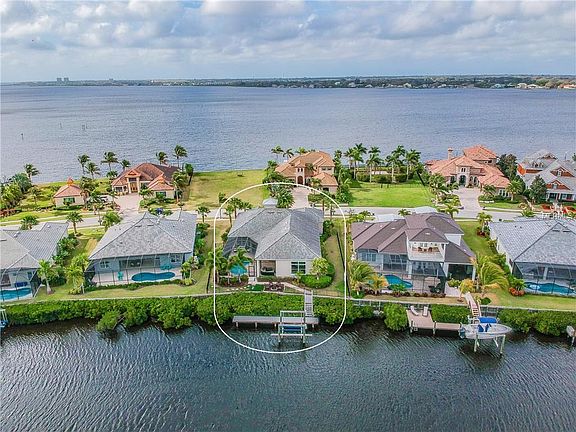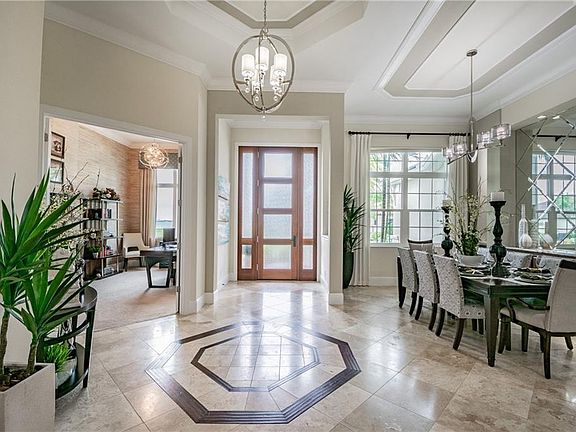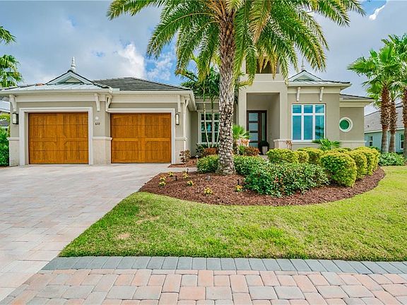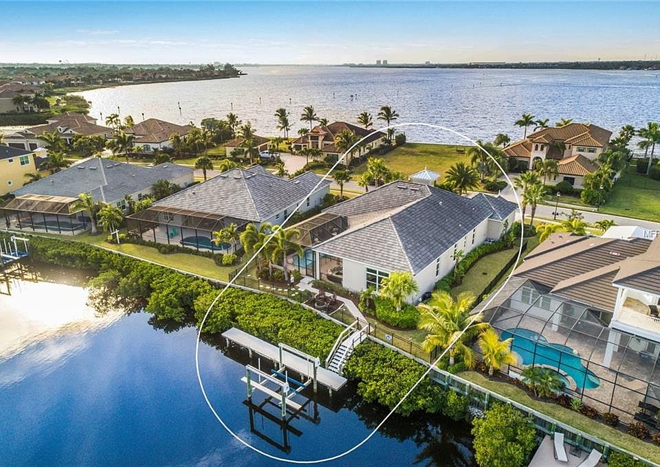 Live the Florida luxury lifestyle in this gorgeous former model home in the gated boating community of The Reserve at Harbour Walk within The Inlets. This estate has all the bells & whistles and will not disappoint! Situated on a deep saltwater canal that is less than 2 minutes away from open water, this home is a boater's dream - an extended dock w/water & electric and a 10,000lb boat lift. This estate features soaring 12 foot ceilings, crown molding throughout the entire house, tray ceilings, coffered ceilings, 7" baseboards, central vacuum, and many built-ins. This home also features incredibly durable hurricane impact windows and doors throughout. No hurricane shutters required! The kitchen features tall, double stacked hardwood cabinets; a center island with a sink, gas cooktop w/pot-filler feature, Thermador appliances, & a built-in desk. Other details include travertine flooring w/wood inlays, dry bar, oversized garage, brick pavers, LED landscape lighting, video surveillance, a large laundry room & more. This professionally decorated coastal contemporary home is built on an amazing lot that is not only elevated, but it is a deep lot to accommodate this one-story estate. After a great day on your boat, you can enjoy watching wildlife & manatees in the saltwater canal while enjoying the cozy firepit in your fenced backyard-steps away from your boat. This rare, gated boating community is just 5 minutes from I-75 -convenient to shopping, restaurants, the beaches, Tampa, St. Pete & Sarasota airports.